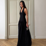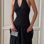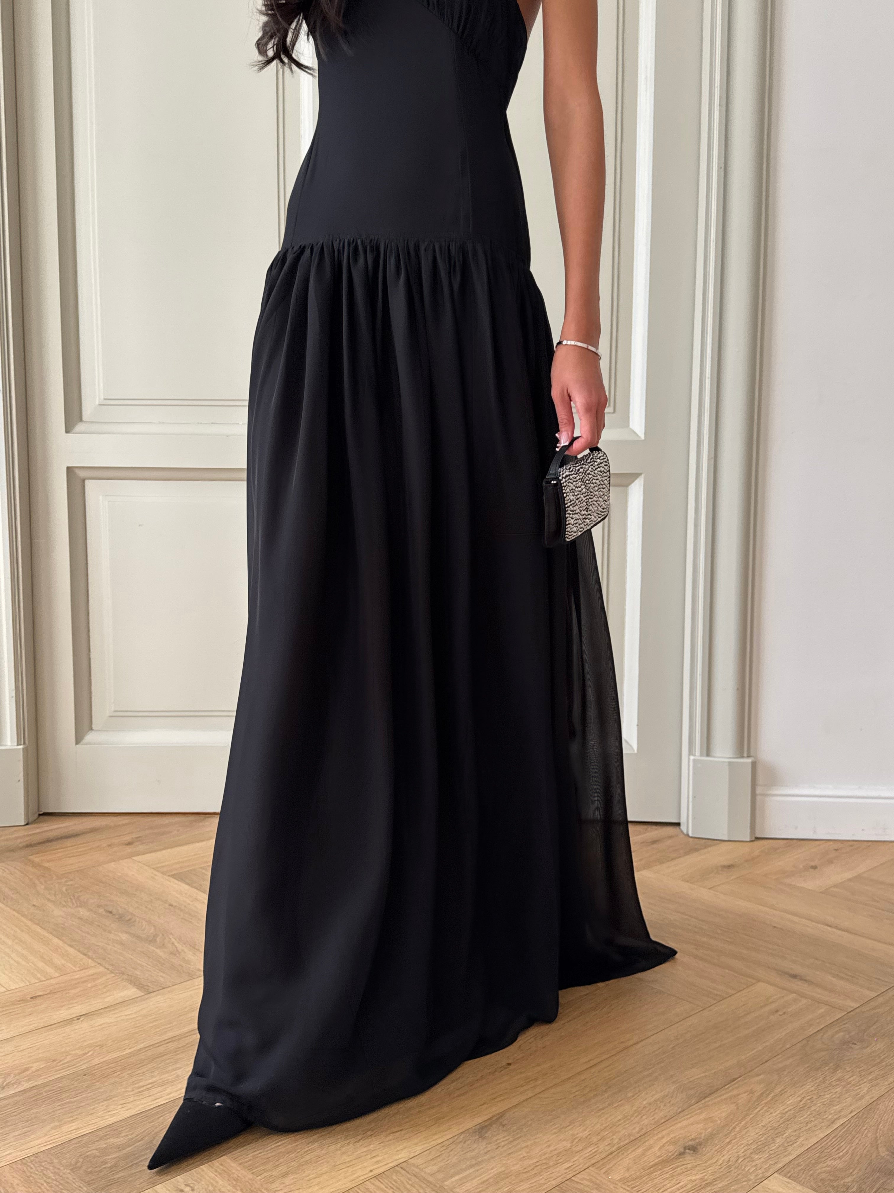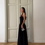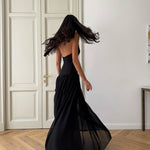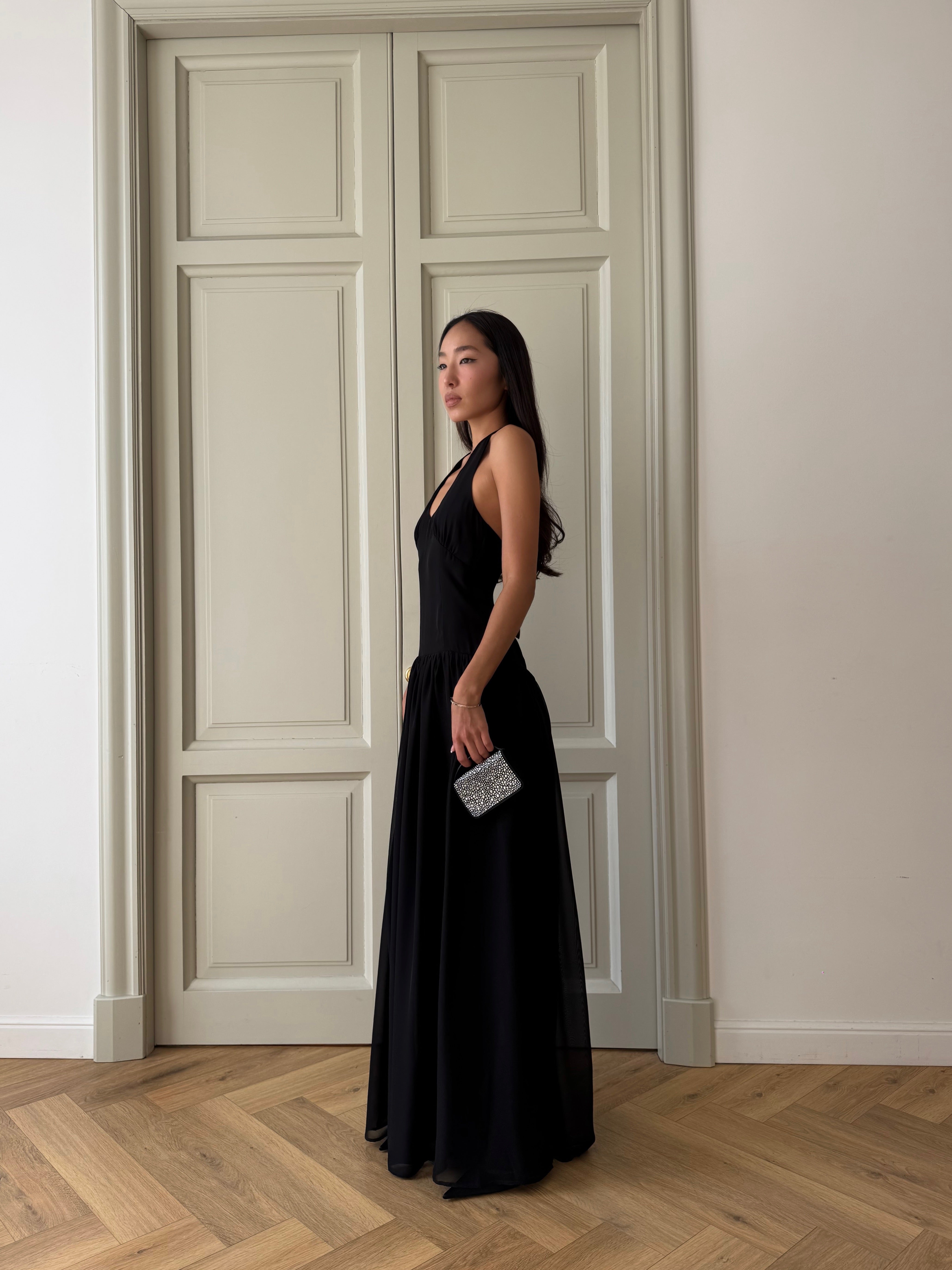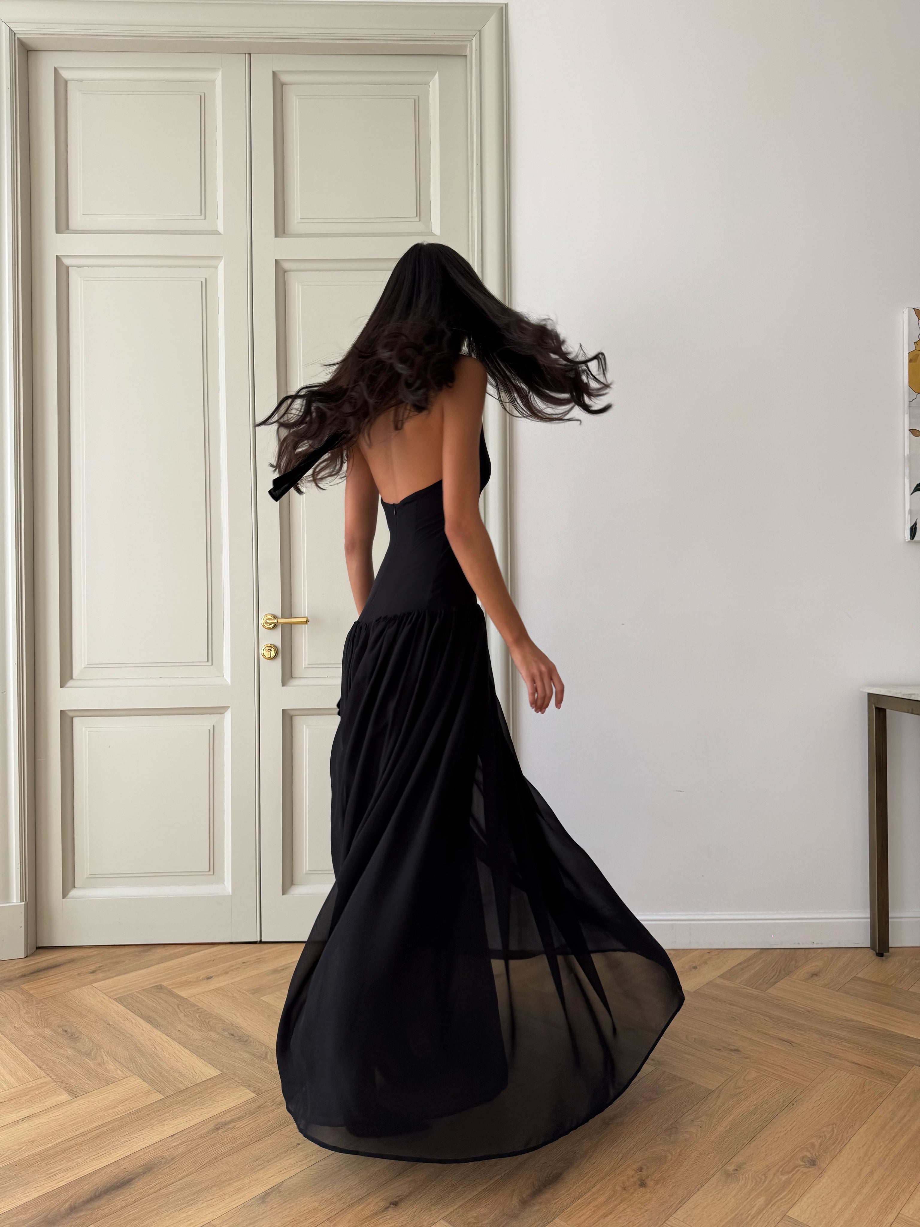 This dress is the embodiment of understated elegance and sensuality. The deep neckline and open back highlight the delicacy of the silhouette, while the lightweight flowing fabric moves beautifully with every step. An ideal choice for an evening out, an important event, or any special occasion when you want to look effortless yet striking.