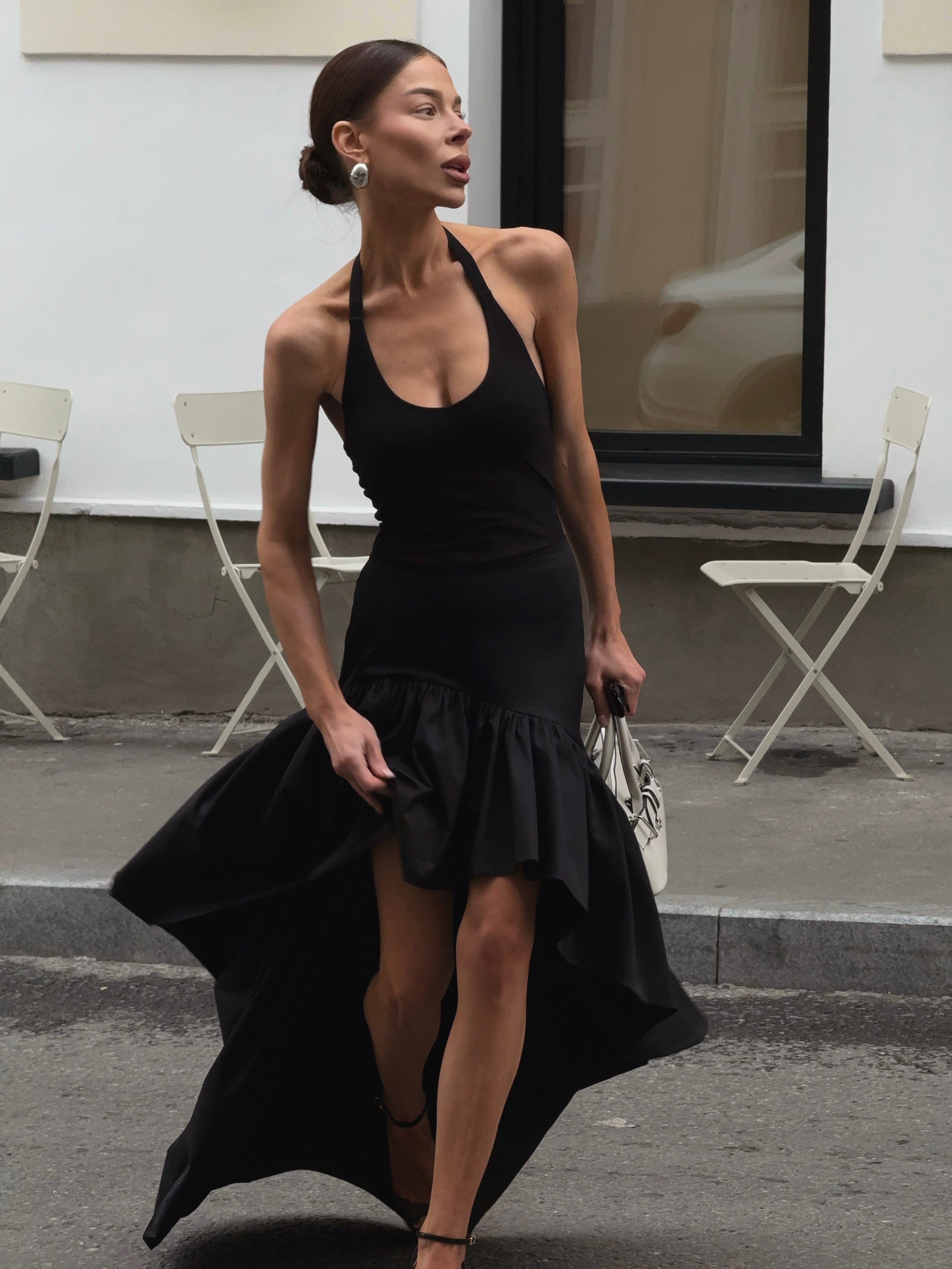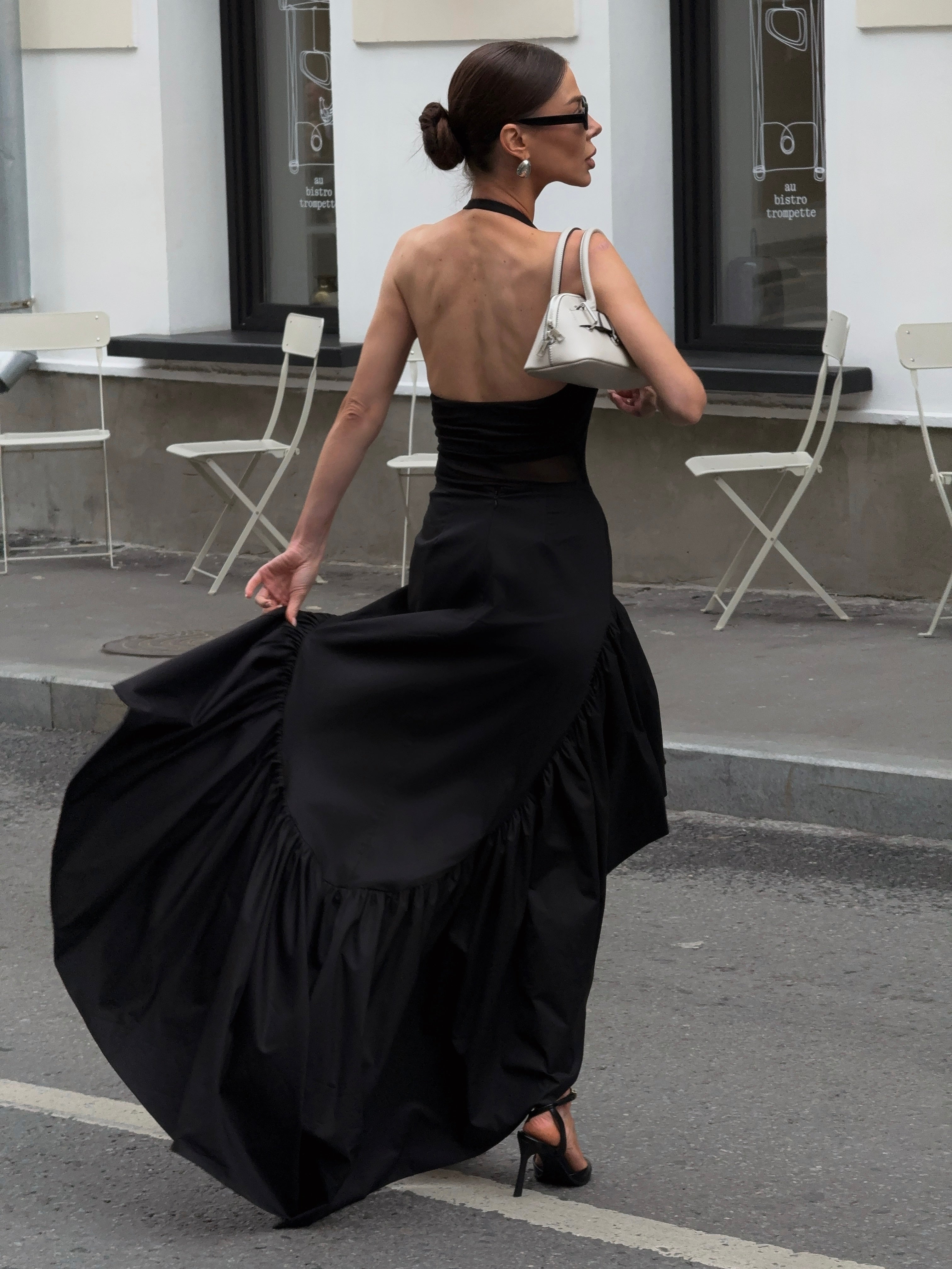 Elegant bodysuit featuring a deep neckline and a sheer insert. The sleek silhouette accentuates the figure, while the open back adds boldness and refinement. A versatile base for both evening and casual looks.