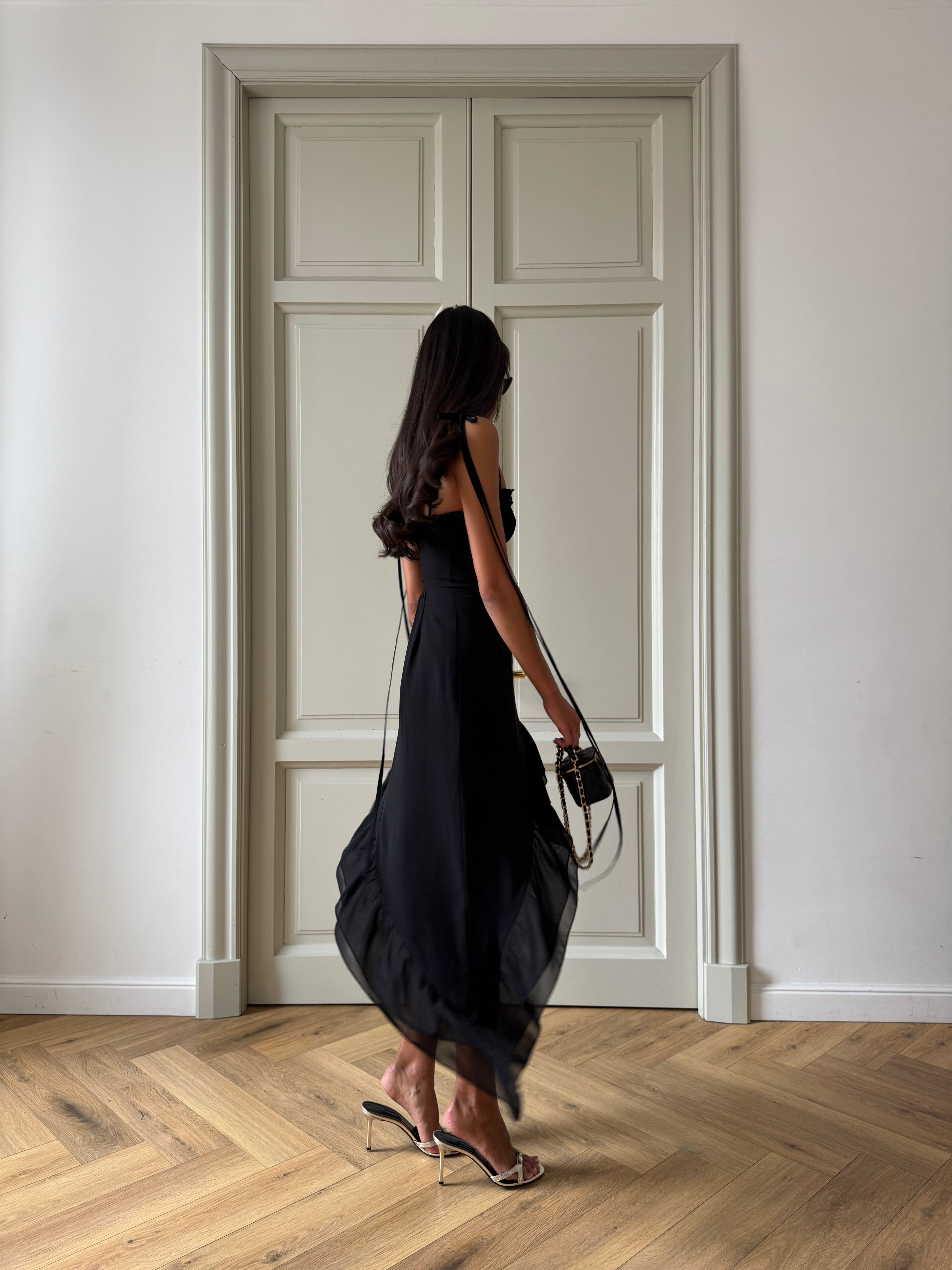 The Bella dress is a stunning must-have piece that exudes elegance and style. Expertly crafted from lightweight crepe chiffon, this dress features delicately tied bow straps that add a touch of femininity to the overall design. Its classic black hue makes it the perfect black dress that every woman should have in her wardrobe.