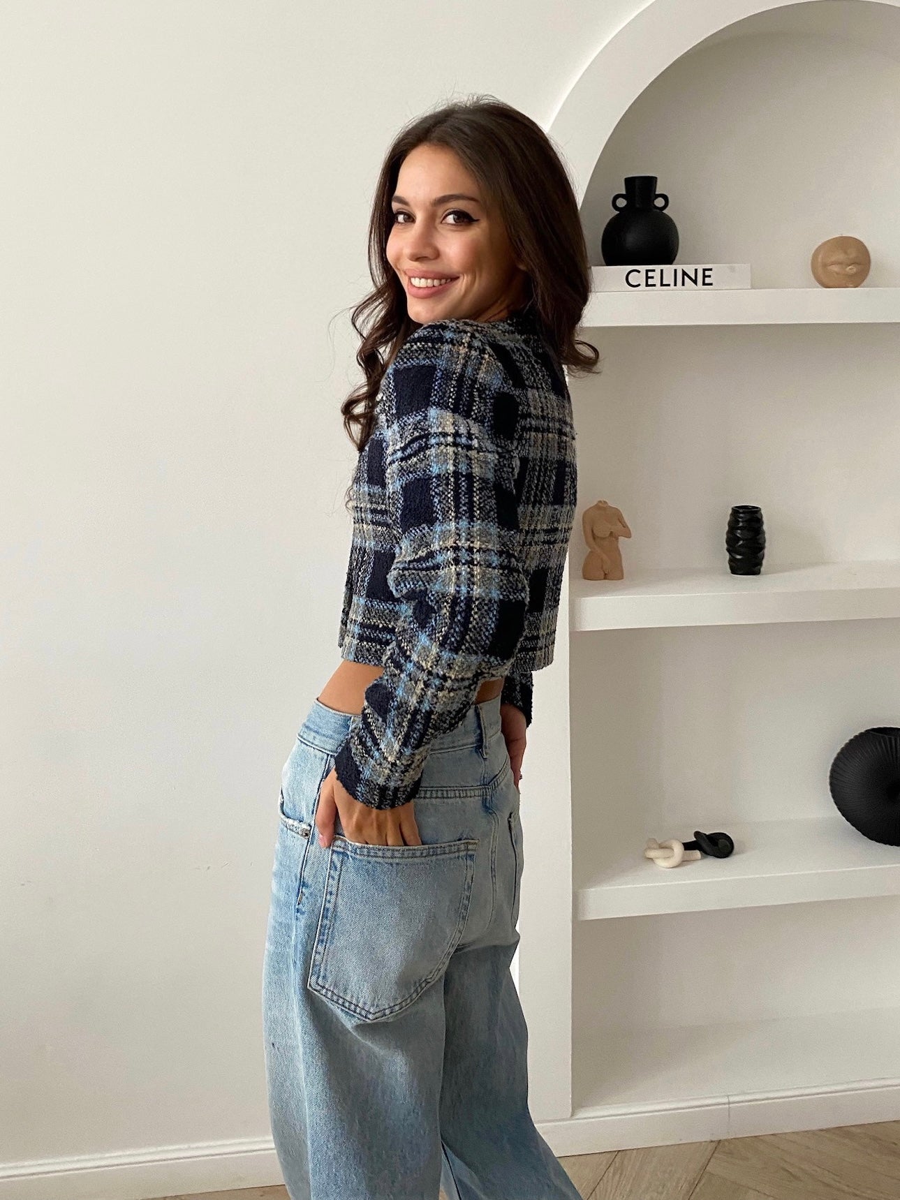 This blue plaid tweed jacket is expertly tailored and features a chic cropped silhouette. The textured fabric adds depth and dimension to the design, while the silk lining in a matching tone ensures a luxurious feel against the skin. With its classic style and modern details, this jacket is a perfect choice for any fashion-forward individual looking to elevate their wardrobe.