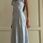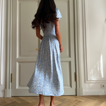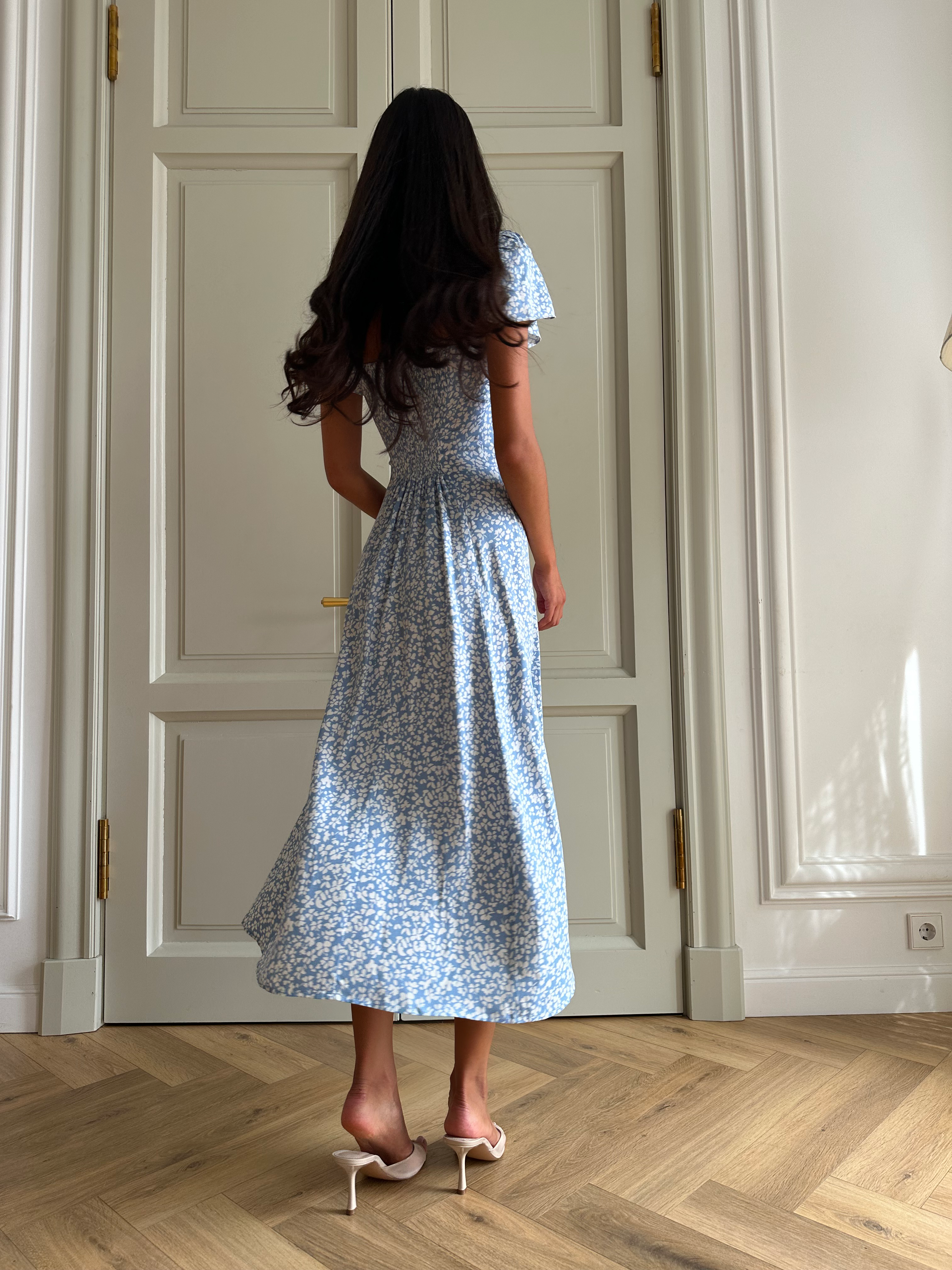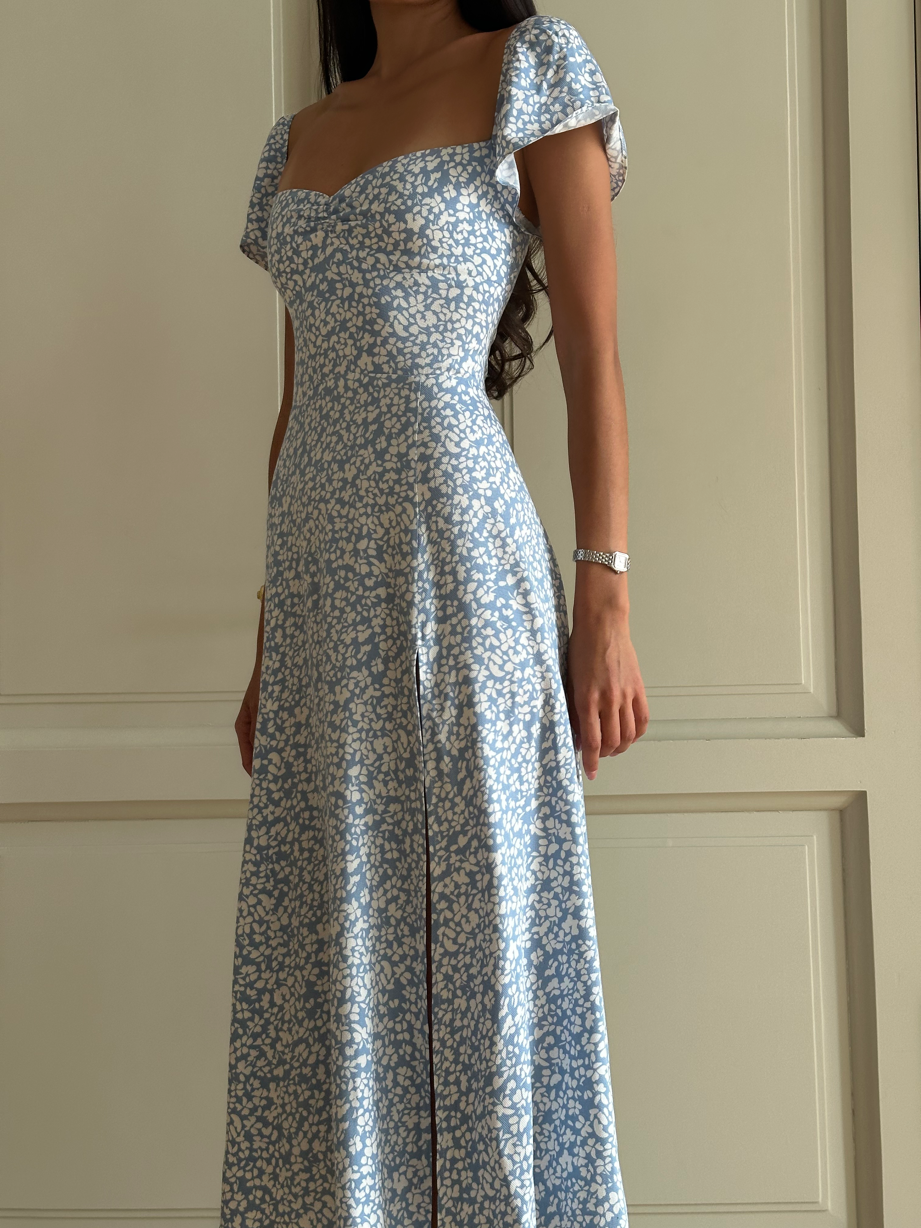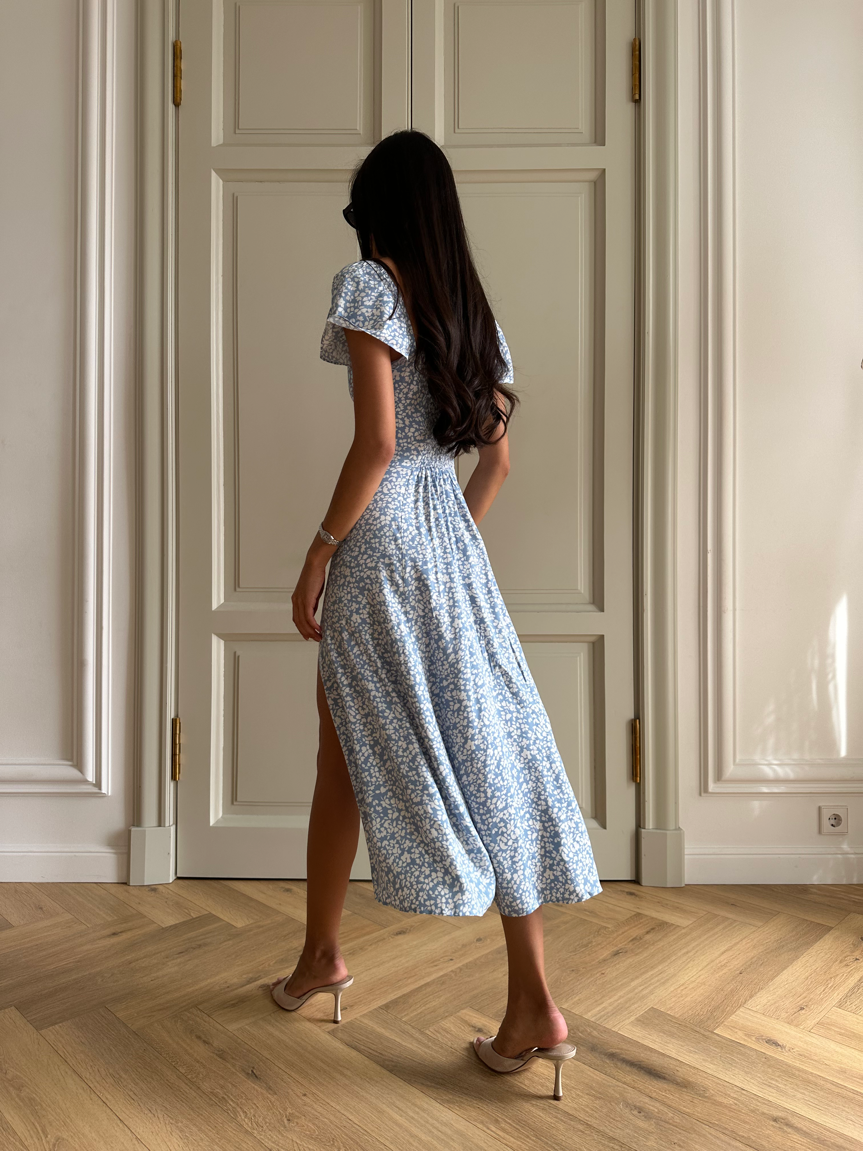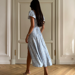 The "Mary" dress crafted from luxuriously soft and fluid viscose fabric, features exquisite puff sleeves and a tasteful slit at the hip, while also beautifully accentuating the waistline for a flattering silhouette.