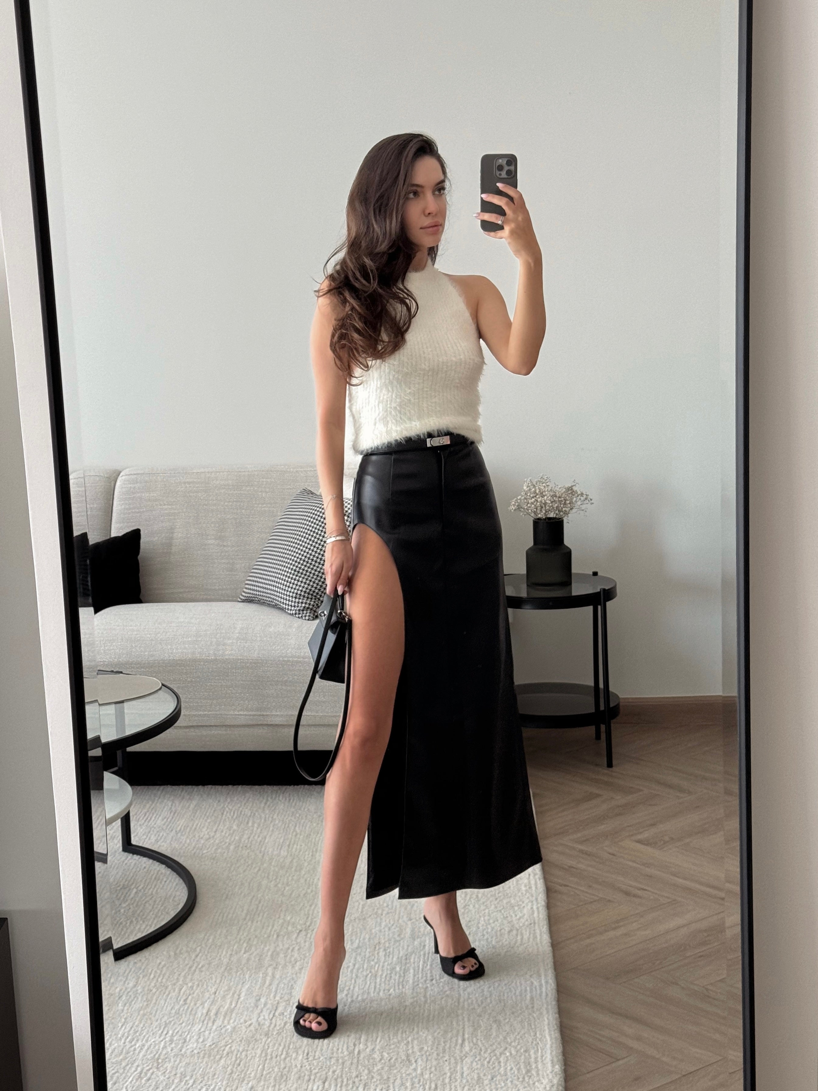 This high-waisted black skirt is crafted from premium Italian eco-leather, combining luxury and sustainability. It features a bold thigh-high side slit on the left, adding an alluring yet sophisticated touch.